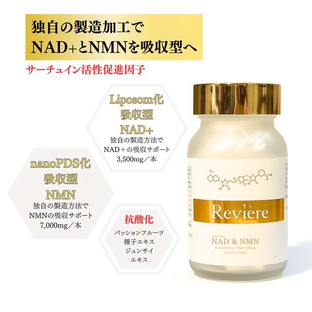 【今日の体感 未来への健康投資】 美肌と長寿の鍵を握る「NAD+&NMN」 サーチュイン遺伝子を呼び覚ますスイッチ 独自の製造加工でNAD+&NMNを吸収型へ ・Liposome化吸収型NAD+ 3500mg ・nanoPDS化吸収型NMN 7000mg ・抗老化 パッションフルーツ種子エキス、ジュンサイエキス 配合 【NAD+】 ミトコンドリアの活性化 ATPの産生促進 活力や代謝維持 加齢と共に体内から減少 【NMN】 体内でNAD+に変換される ATPの産生促進 活力や代謝維持 加齢と共に体内から減少 *こちらの注文は定期便となります。